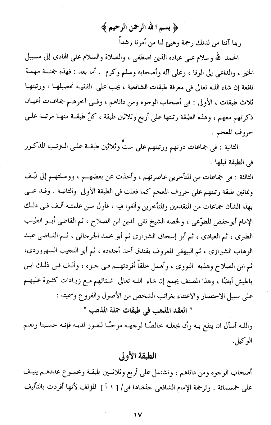 الحمد للَّه وسلام على عباده الذين اصطفى، والصلاة والسلام على الهادى إلى سبيل الخير، والداعى إلى الوفا، وعلى آله وأصحابه وسلم وكرم. أما بعد: فهذه جملة مهمة نافعة إن شاء اللَّه تعالى في معرفة طبقات الشافعية، يجب على الفقيه تحصيلها، ورتبتها ثلاث طبقات، الأولى: في أصحاب الوجوه ومن داناهم، وفى آخرهم جماعات أعيان ذكرتهم معهم، وهذه الطبقة رتبتها على أربع وثلاثين طبقة، كلّ طبقة منها مرتبة على حروف المعجم.