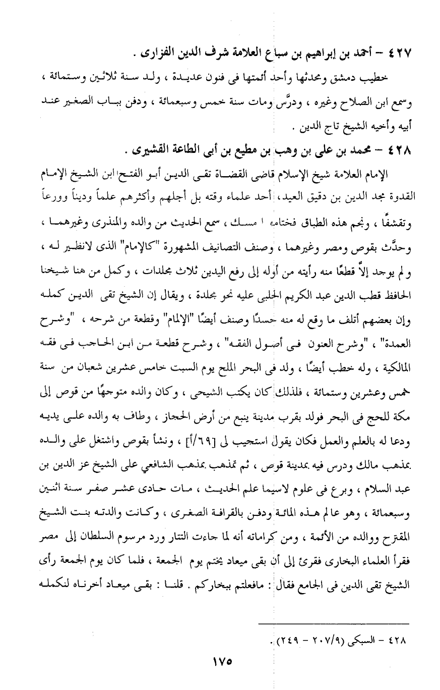 الإمام العلامة شيخ الإسلام قاضى القضاة تقى الدين أبو الفتح ابن الشيخ الإمام القدوة مجد الدين بن دقيق العيد، أحد علماء وقته بل أجلهم وأكثرهم علمًا ودينًا وورعًا وتقشفًا، ونجم هذه الطباقا فختامها مسك، سمع الحديث من والده والمنذري وغيرهما، وحدَّث بقوص ومصر وغيرهما، وصنف التصانيف المشهورة "كالإمام" الذى لا نظير له، ولم يوجد إلا قطعًا منه رأيته قوله أوله إلى رفع اليدين ثلاث مجلدات، وكمل من هنا شيخنا الحافظ قطب الدين عبد الكريم الحلبي عليه نحو مجلدة، ويقال إن، الشيخ تقى الدين كمله وإن بعضهم أتلف ما وقع له منه حسداَ وصنف أيضا "الإلمام" وقطعة من شرحه، و"شرح العمدة"، و"شرح العنون في أصول الفقه"، وشرح قطعه من ابن الحاجب في فقه المالكية، وله خطب أيضًا، ولد في البحر الملح يوم السبت خامس عشرين شعبان من سنة خمس وعشرين وستمائة، فلذلك كان يكتب الشيحى، وكان والده متوجهًا من قوص إلى مكة للحج في البحر فولد بقرب مدينة ينبع من أرض الحجاز، وطاف به والده على يديه ودعا له بالعلم والعمل فكان يقول استجيب لي، ونشأ بقوص واشتغل على والده بمذهب مالك ودرس فيه بمدينة قوص، ثم تمذهب بمذهب الشافعى على الشيخ عز الدين بن عبد السلام، وبرع في علوم لا سيما علم الحديث، مات حادى عشر صفر سنة اثنين وسبعمائة، وهو عالم هذه المائة ودفن بالقرافة الصغرى، وكانت والدته بنت الشيخ المقترح ووالده من الأئمة، ومن كراماته أنه لما جاءت التتار ورد مرسوم السلطان إلى مصر فقرأ العلماء البخارى فقرئ إلى أن بقى ميعاد يختم يوم الجمعة، فلما كان يوم الجمعة رأى الشيخ تقى الدين في الجامع فقال: ما فعلتم ببخاركم. قلنا: بقى ميعاد أخرناه لنكمله