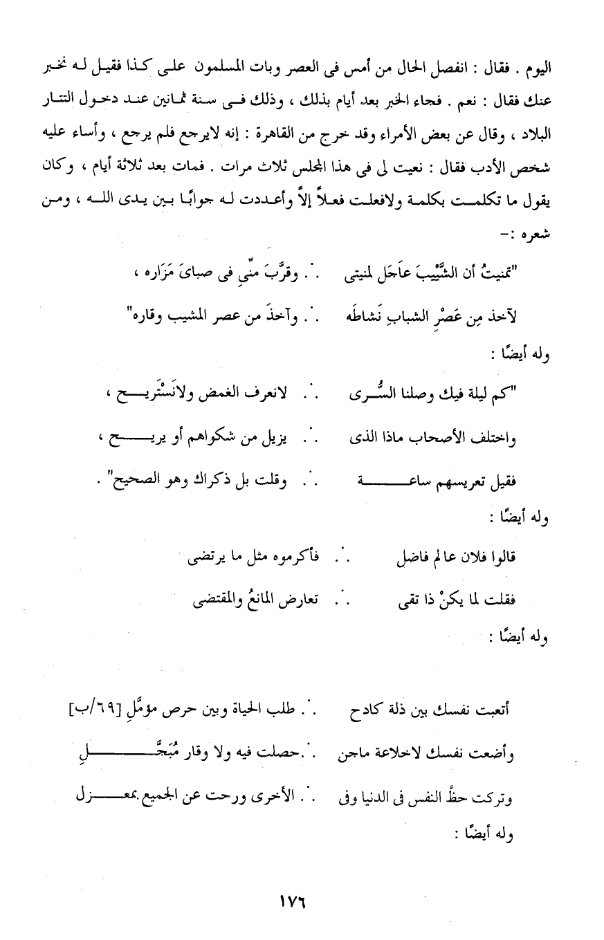 اليوم. فقال: انفصل الحال من أمس في العصر وبات المسلمون على كذا فقيل له نخبر عنك فقال: نعم. فجاء الخبر بعد أيام بذلك، وذلك في سنة ثمانين عند دخول التتار البلاد، وقال عن بعض الأمراء وفد خرج من القاهرة: إنه لا يرحع فلم يرجع، وأساء عليه شخص الأدب فقال: نعيت لى في هذا المجلس ثلاث مرات. فمات بعد ثلاثة أيام، وكان يقول ما تكلمت بكلمة ولا فعلت فعلًا إلَّا وأعددت له جوابًا بين يدى اللَّه، ومن شعره:-