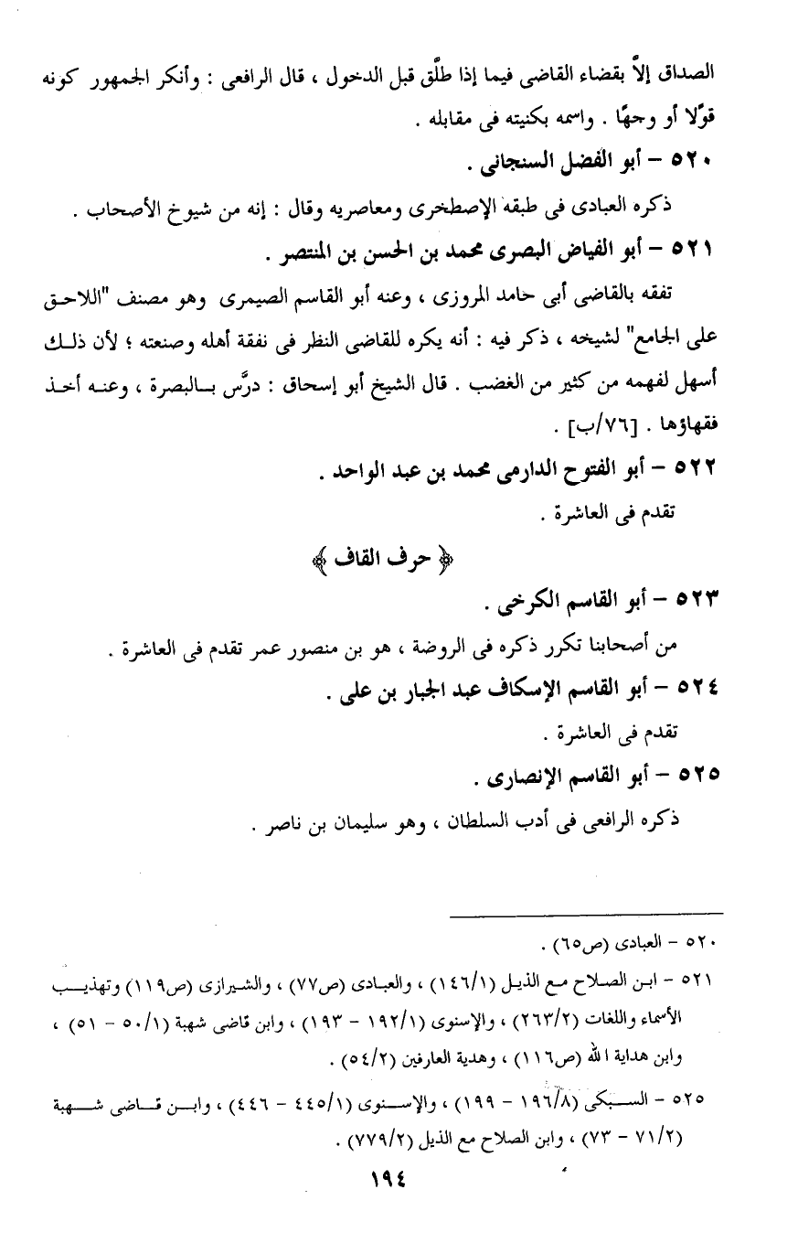 521 - ابن الصلاح مع الذيل (1/ 146)، والعبادى (ص 77)، والشيرازى (ص 119) وتهذيب الأسماء واللغات (2/ 263)، والإسنوى (1/ 192 - 193)، وابن قاضى شهبة (1/ 50 - 51)، وابن هداية اللَّه (ص 116)، وهدية العارفين (2/ 54).