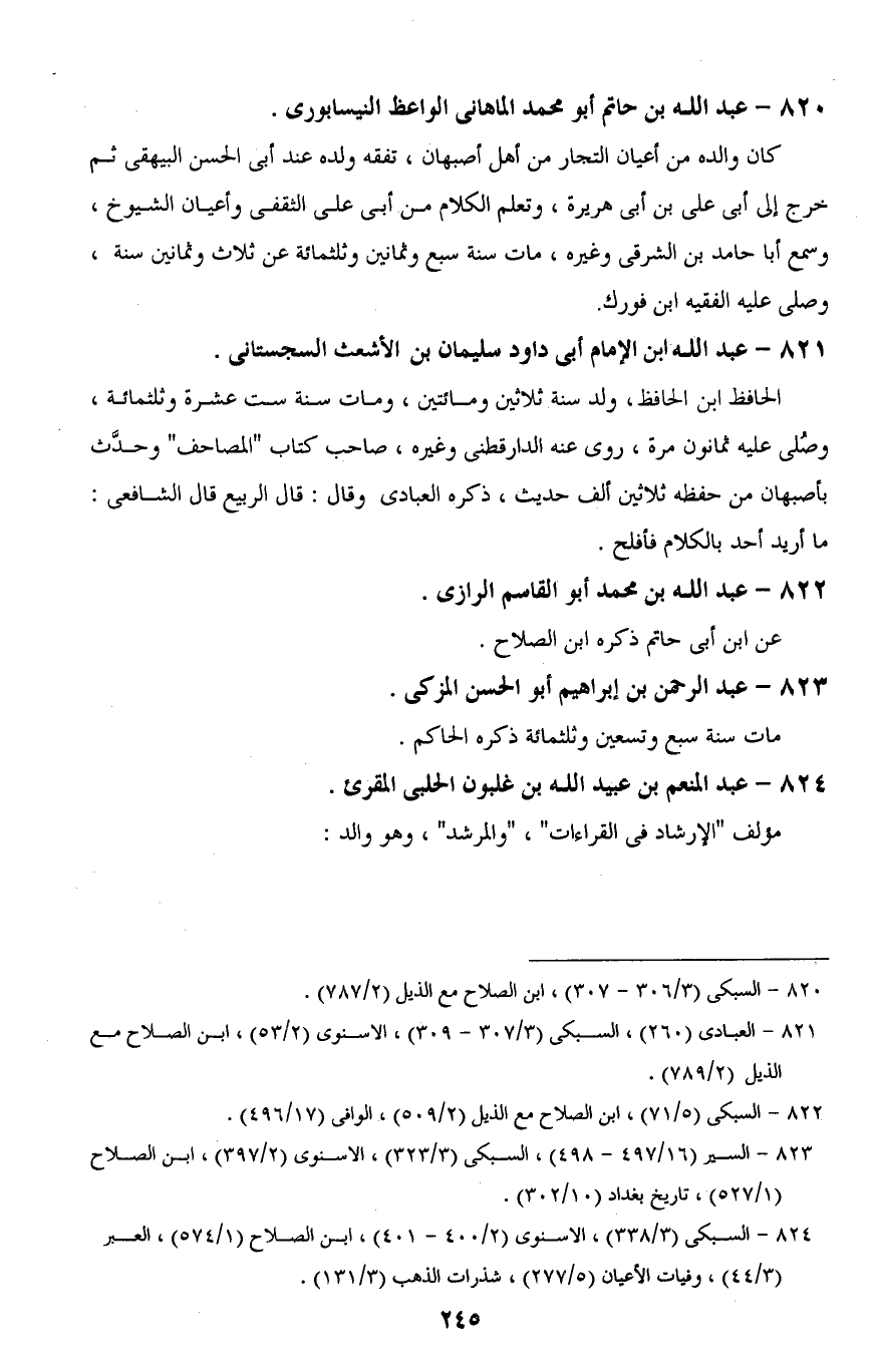 823 - السير (16/ 497 - 498)، السبكى (3/ 323)، الإسنوى (2/ 397)، ابن الصلاح (1/ 527)، تاريخ بغداد (10/ 302).