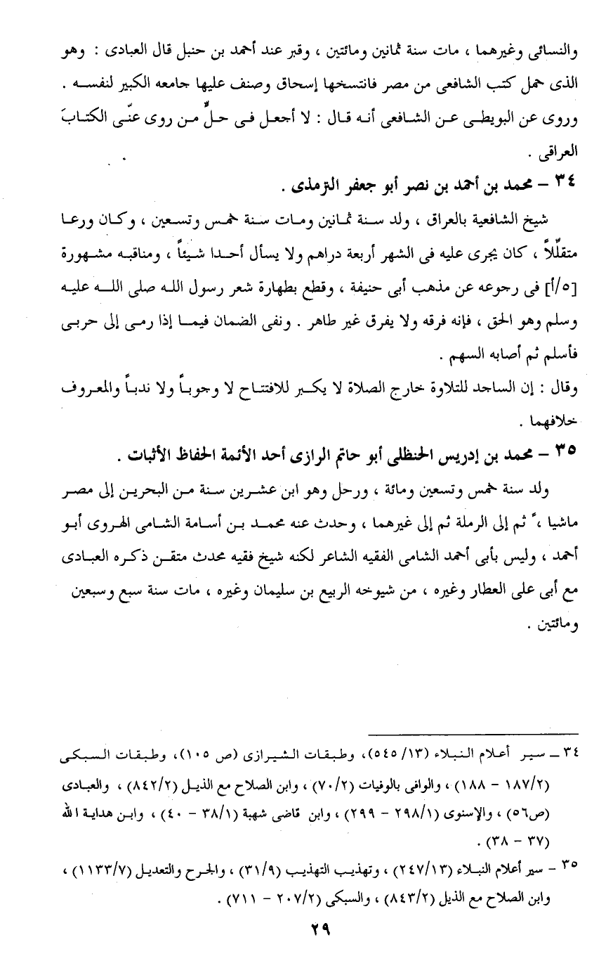 34 - سير أعلام النبلاء (13/ 545)، وطبقات الشيرازى (ص 105)، وطبقات السبكى (2/ 187 - 188)، والوافى بالوفيات (2/ 70)، وابن الصلاح مع الذيل (2/ 842)، والعبادى (ص 56)، والإسنوى (1/ 298 - 299)، وابن قاضى شهبة (1/ 38 - 40)، وابن هداية اللَّه (37 - 38).