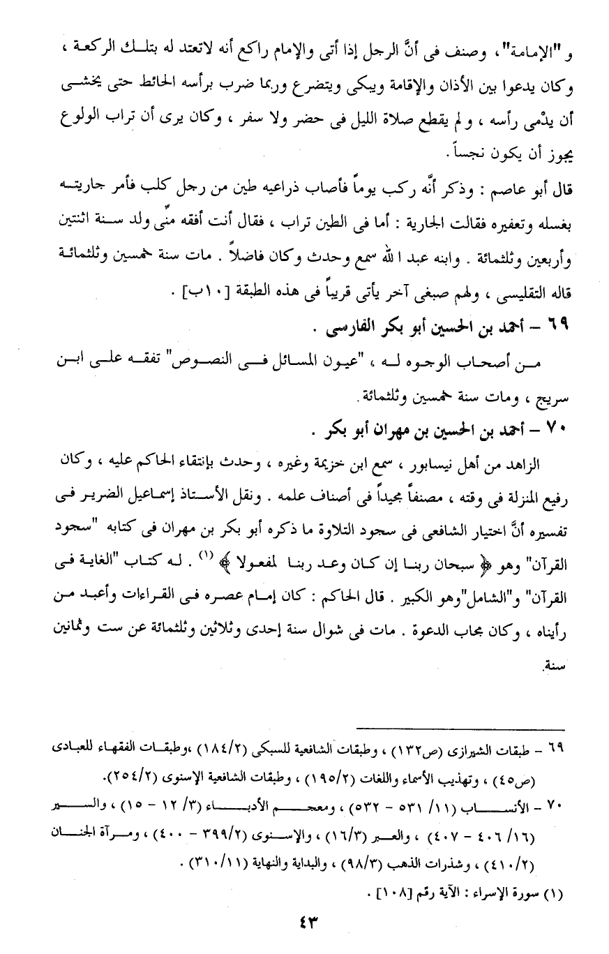 69 - طبقات الشيرازى (ص 132)، وطبقات الشافعية للسبكى (2/ 184)، وطبقات الفقهاء للعبادى (ص 45)، وتهذيب الأسماء واللغات (2/ 195)، وطبقات الشافعية الإسنوي (2/ 254).