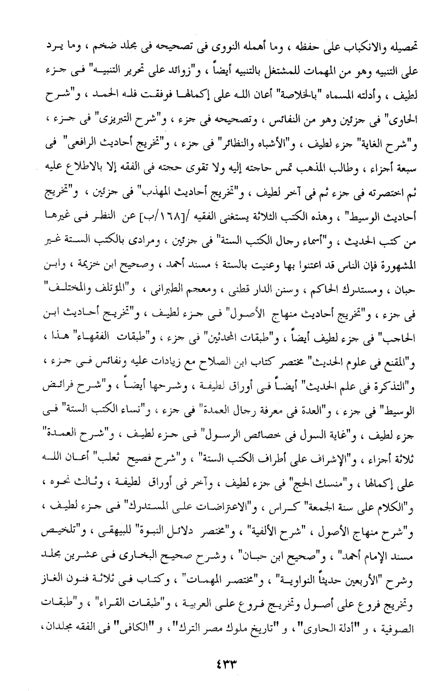 تحصيله والانكباب على حفظه، وما أهمله النووى في تصحيحه مجلد ضخم، وما يرد على التنبيه وهو من المهمات للمشتغل بالتنبيه أيضًا، و"زوائد على تحرير التنبيه" في جزء لطيف، وأدلته المسماه "بالخلاصة" أعان اللَّه على إكمالها فوفقت فله الحمد، و"شرح الحاوى" في جزئين وهو من النفائس، وتصحيحه في جزء، و"شرح التبريزى" في جزء، و"شرح الغاية" جزء لطيف، و"الأشباه والنظائر" في جزء، و"تخريج أحاديث الرافعى" في سبعة أجزاء، وطالب المذهب تمس حاجته إليه ولا تقوى حجته في الفقه إلا بالاطلاع عليه ثم اختصرته في جزء ثم في آخر لطيف، و"تخريج أحاديث المهذب" في جزئين، و"تخريج أحاديث الوسيط"، وهذه الكتب الثلاثة الفقيه عن النظر في غيرها من كتب الحديث، و"أسماء رجال الكتب الستة" في جزئين، ومرادى بالكتب الستة غير المشهورة فإن الناس قد اعتنوا بها وعنيت بالستة؛ مسند أحمد، وصحيح ابن خزيمة، وابن حبان، ومستدرك الحاكم، وسنن الدارقطنى، ومعجم الطبرانى، و"المؤتلف والمختلف" في جزء، و"تخريج أحاديث منهاج الأصول" في جزء لطيف، و"تخريج أحاديث ابن الحاجب" في جزء لطيف أيضًا، و"طبقات المحدثين" في جزء، و"طبقات الفقهاء" هذا، و"المقنع في علوم الحديث" مختصر كتاب ابن الصلاح مع زيادات عليه ونفائس في جزء، و"التذكرة في علم الحديث" أيضًا في أوراق لطيفة، وشرحها أيضًا، و"شرح فرائض الوسيط" في جزء، و"العدة في معرفة رجال العمدة" في جزء، و"نساء الكتب الستة" في جزء لطيف، و"غاية السول في خصائص الرسول" في جزء، و"شرح العمدة" ثلاثة أجزاء، و"الإشراف على أطراف الكتب الستة"، و"شرح فصيح ثعلب" أعان اللَّه على إكمالها، و"منسك الحج" في جزء لطيف، وآخر في أرواق لطيفة، وثالث نحوه، و"الكلام على سنة الجمعة" كراس، و"الاعتراضات على المستدرك" في جزء لطيف، و"شرح منهاج الأصول"، "شرح الألفية"، و"مختصر في دلائل النبوة"، و"تلخيص مسند الإمام أحمد"، و"صحيح ابن حبان"، وشر صحيح البخارى في عشرين مجلد وشرح "الأربعين حديثًا النواوية"، و"مختصر المهمات"، وكتاب في ثلاثة فنون الغاز وتخريج فروع على أصول وتخريج فروع على العربية، و"طبقات القراء"، و"طبقات الصوفية، و"أدلة الحاوى"، و"تاريخ ملوك مصر الترك"، و"الكافى" في الفقه مجلدان،
