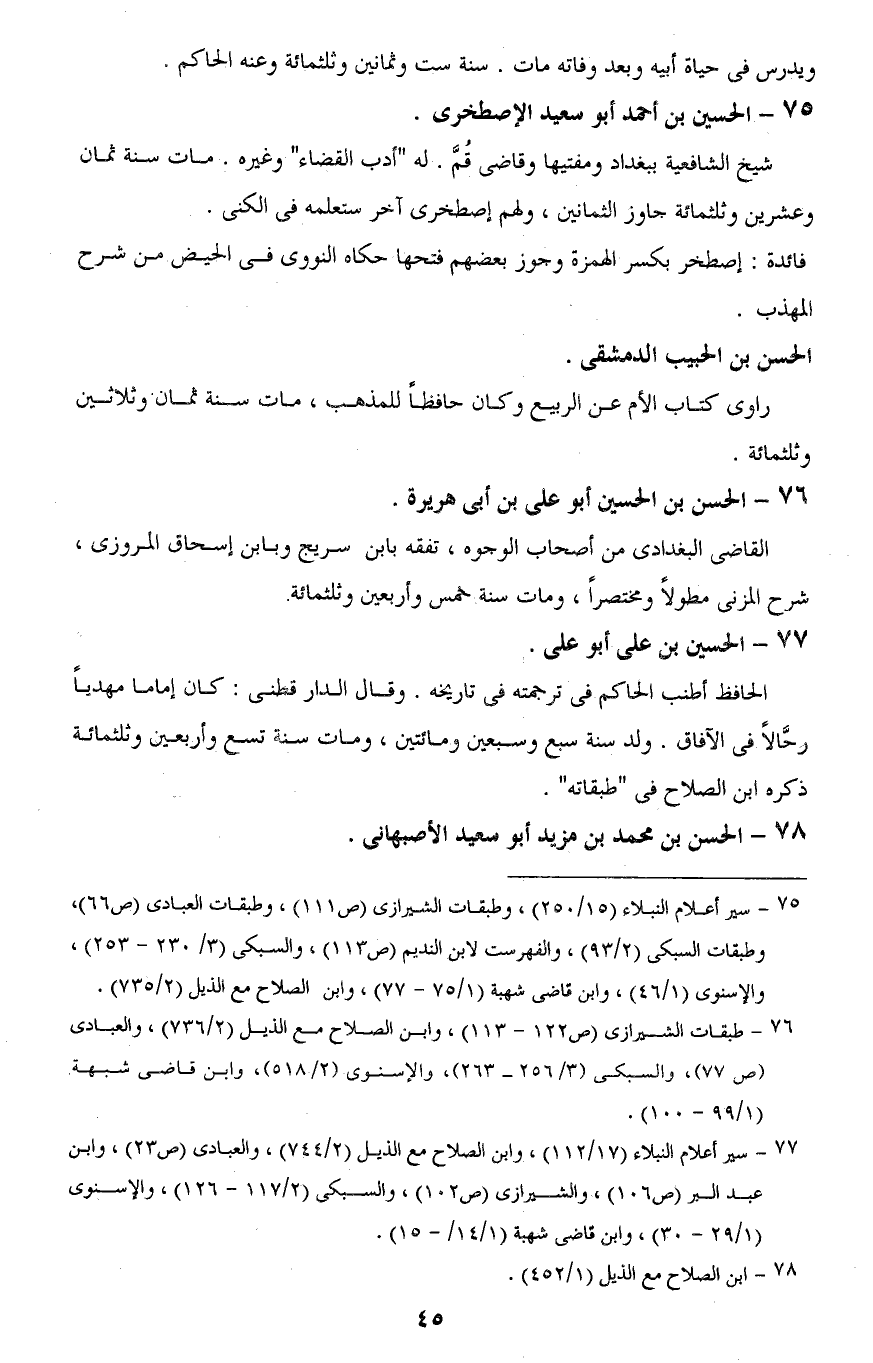 75 - سير أعلام النبلاء (15/ 250)، وطبقات الشيرازى (ص 111)، وطبقات العبادى (ص 66)، وطبقات السبكى (2/ 93)، والفهرست لابن النديم (ص 113) والسبكى (3/ 230 - 253) , والإسنوى (1/ 46)، وابن قاضى شهبة (1/ 75 - 77)، وابن الصلاح مع الذيل (2/ 735).