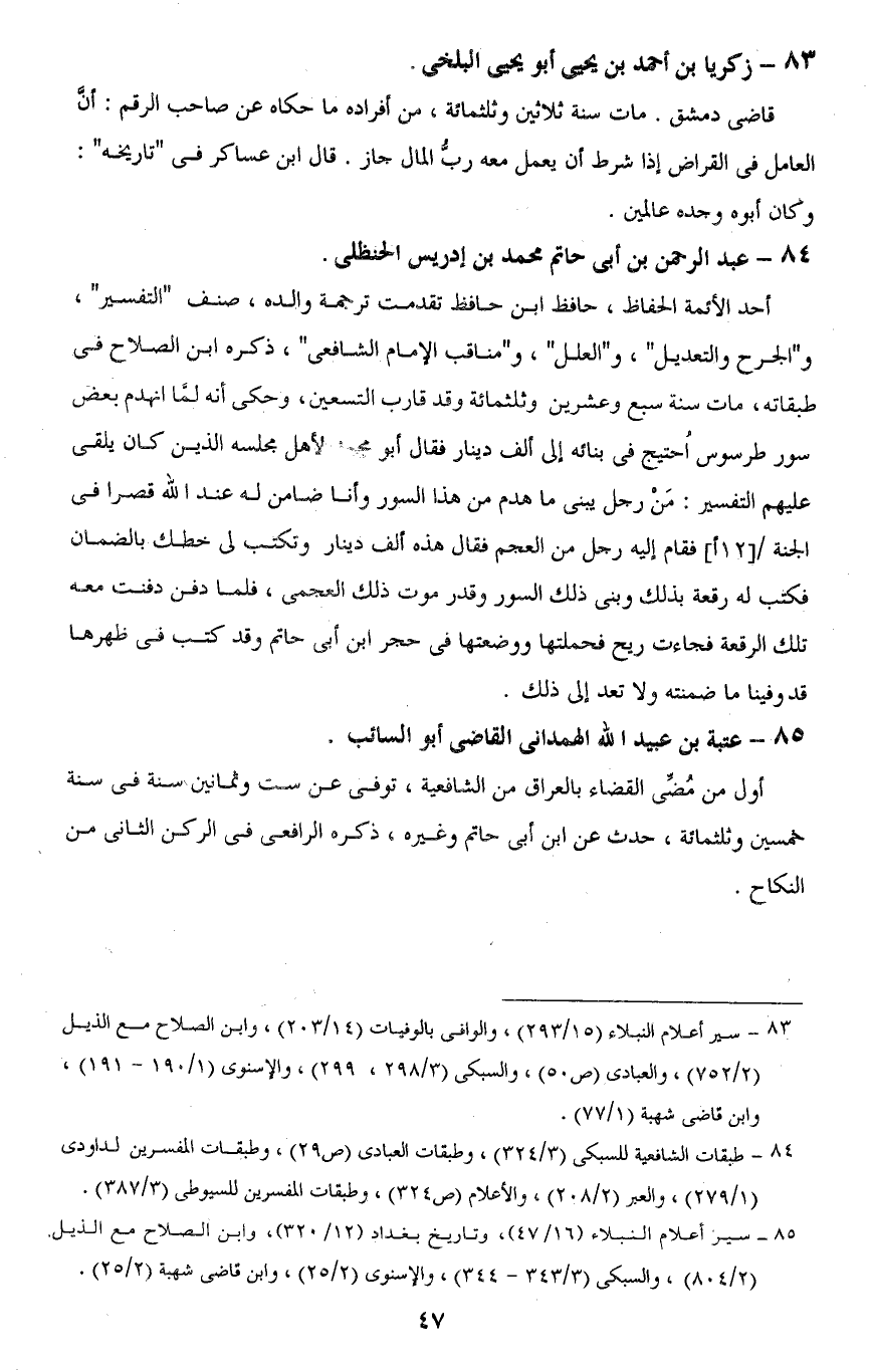 84 - طبقات الشافعية للسبكى (3/ 324)، وطبقات العبادى (ص 29) , وطبقات المفسرين لداودى (1/ 279)، والعبر (2/ 280) , والأعلام (ص 324)، وطبقات المفسرين للسيوطي (3/ 387).