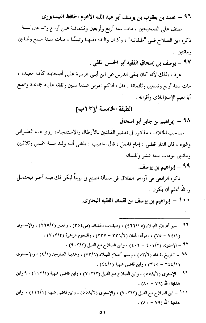 98 - تاريخ بغداد (6/ 53)، وسير أعلام النبلاء (6/ 53)، وهدية العارفين (1/ 4)، والإسنوى (1/ 344 - 345)، وابن قاضى شهبة (1/ 44).