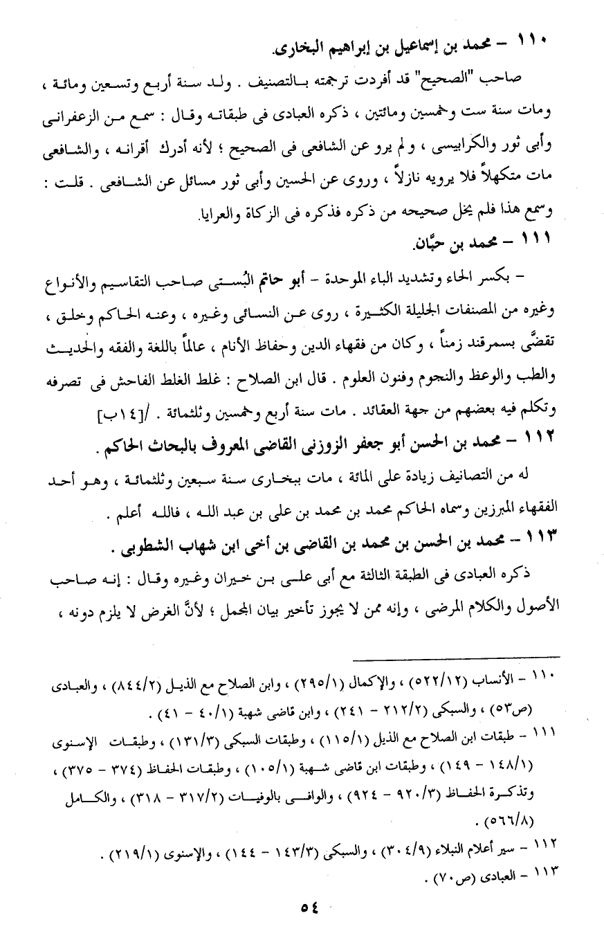 110 - الأنساب (12/ 522)، والإكمال (1/ 295)، وابن الصلاح مع الذيل (2/ 844)، والعبادى (ص 53)، والسبكى (2/ 212 - 241)، وابن قاضى شهبة (1/ 40 - 41).