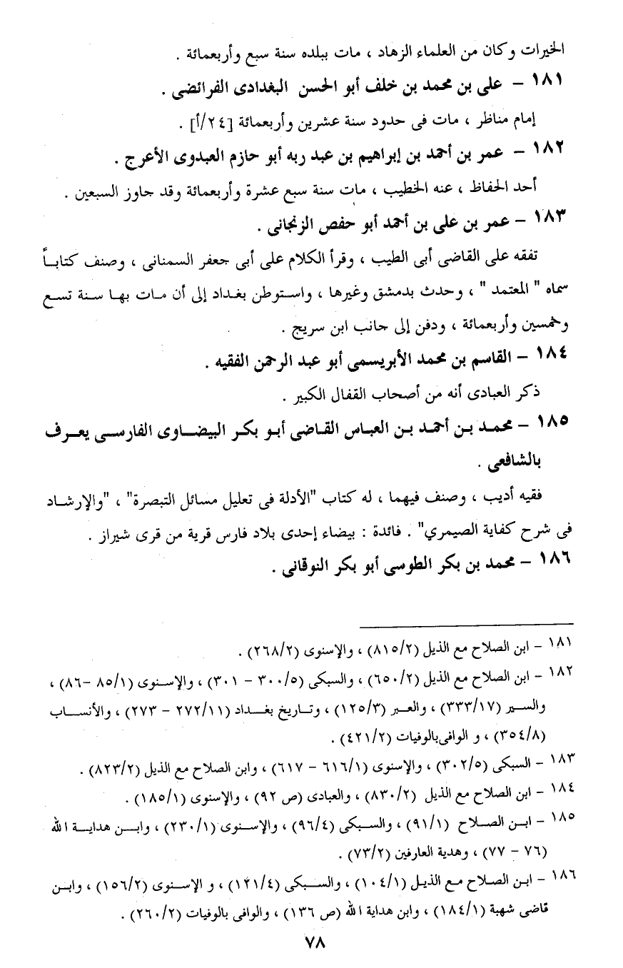 182 - ابن الصلاح مع الذيل (2/ 650)، والسبكى (5/ 300 - 301)، والإسنوى (1/ 85 - 86)، والسير (17/ 333)، والعبر (3/ 125)، وتاريخ بغداد (11/ 272 - 273)، والأنساب (8/ 354)، والوافى بالوفيات (2/ 421).