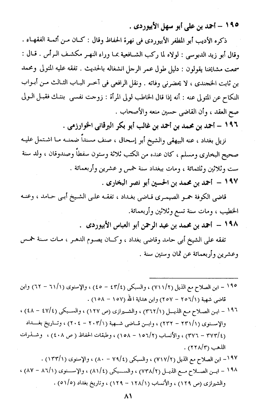 198 - ابن الصلاح مع الذيل (2/ 738)، والسبكى (4/ 81)، والإسنوى (1/ 86 - 87)، والشيرازى (ص 129)، والأنساب (1/ 128 - 129)، وتاريخ بغداد (5/ 51).