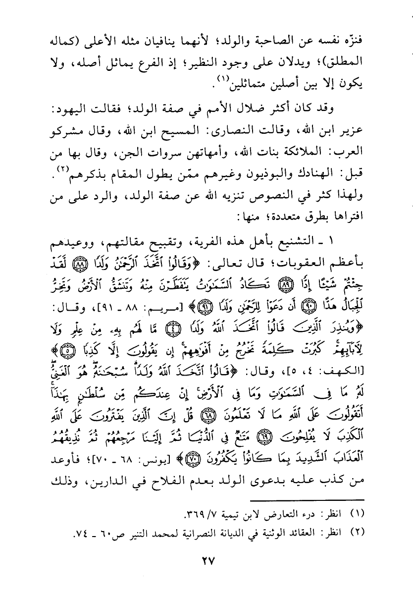 وقد كان أكثر ضلال الأمم في صفة الولد، فقالت اليهود: عزير ابن الله، وقالت النصارى: المسيح ابن الله، وقال مشركو العرب: الملائكة بنات الله، وأمهاتهن سروات الجن، وقال بها من قبل: الهنادك والبوذيون وغيرهم من يطول المقام بذكرهم (¬2). ولهذا كثر في النصوص تنزيه الله عن صفة الولد، والرد على من افتراها بطرق متعددة، منها: