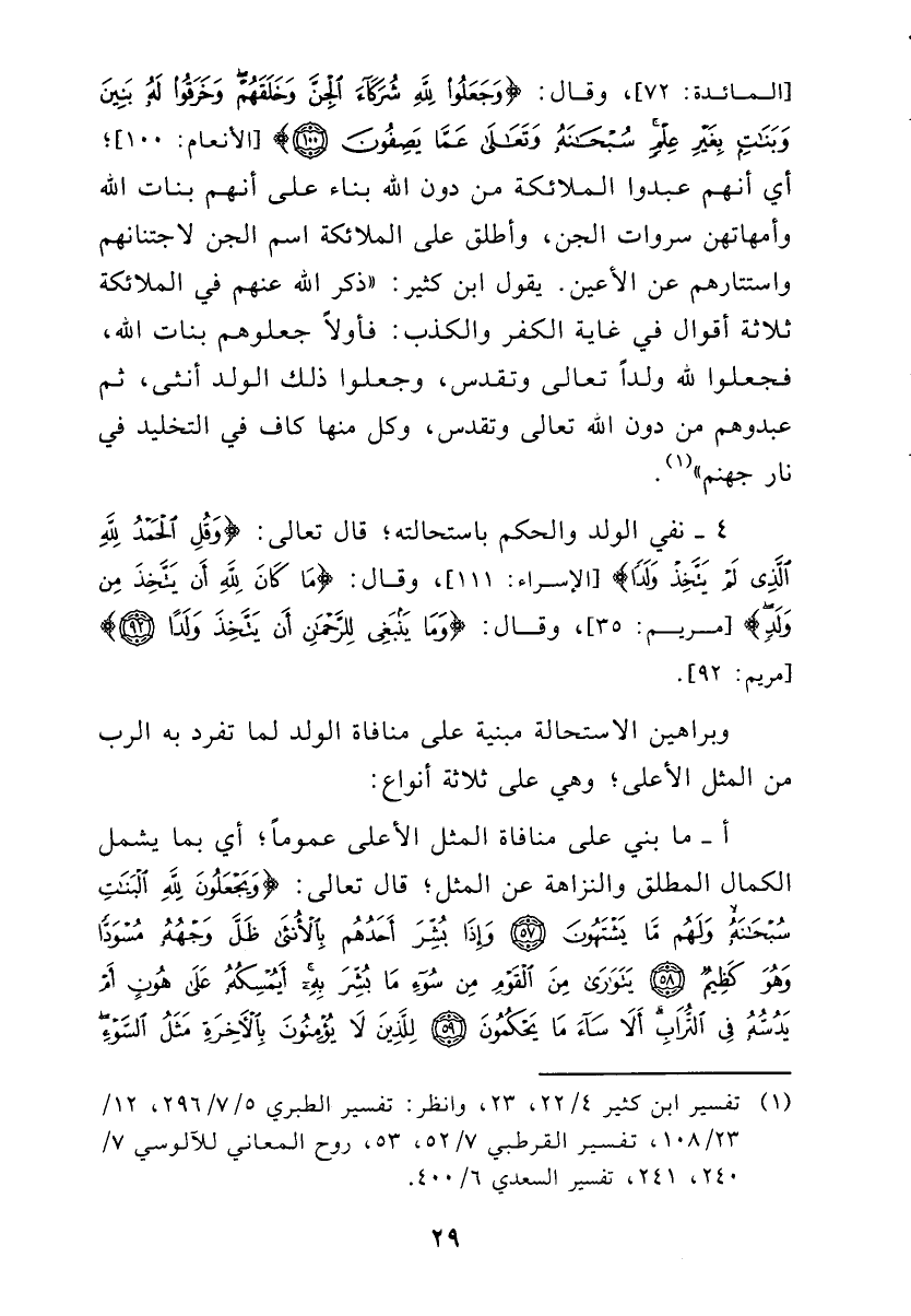 4 - نفي الولد والحكم باستحالته، قال تعالى: {وَقُلِ الْحَمْدُ لِلَّهِ الَّذِي لَمْ يَتَّخِذْ وَلَدًا} [الإسراء: 111]، وقال: {مَا كَانَ لِلَّهِ أَنْ يَتَّخِذَ مِنْ وَلَدٍ} [مريم: 35]، وقال: {وَمَا يَنْبَغِي لِلرَّحْمَنِ أَنْ يَتَّخِذَ وَلَدًا} [مريم: 92].