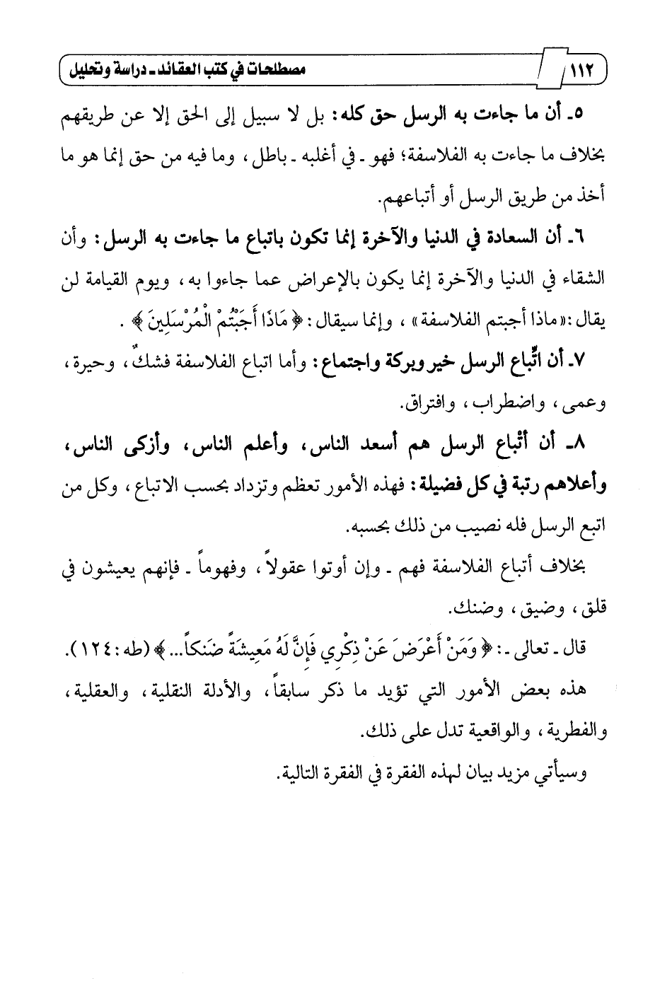 6ـ أن السعادة في الدنيا والآخرة إنما تكون باتباع ما جاءت به الرسل: وأن الشقاء في الدنيا والآخرة إنما يكون بالإعراض عما جاءوا به، ويوم القيامة لن يقال:"ماذا أجبتم الفلاسفة"، وإنما سيقال: {مَاذَا أَجَبْتُمْ الْمُرْسَلِينَ} .