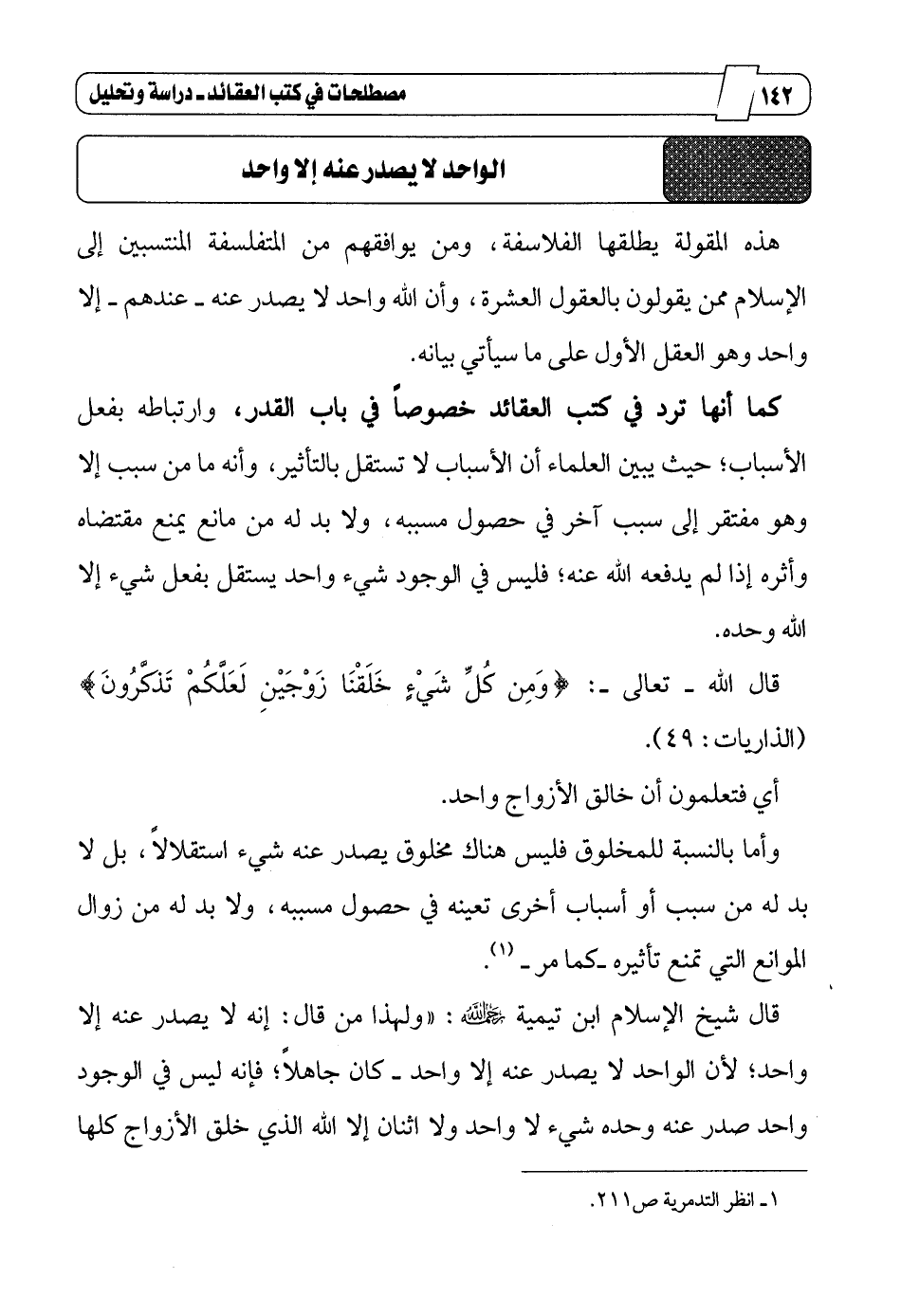 قال شيخ الإسلام ابن تيمية رحمه الله: "ولهذا من قال: إنه لا يصدر عنه إلا واحد؛ لأن الواحد لا يصدر عنه إلا واحد _ كان جاهلاً؛ فإنه ليس في الوجود واحد صدر عنه وحده شيء لا واحد ولا اثنان إلا الله الذي خلق الأزواج كلها