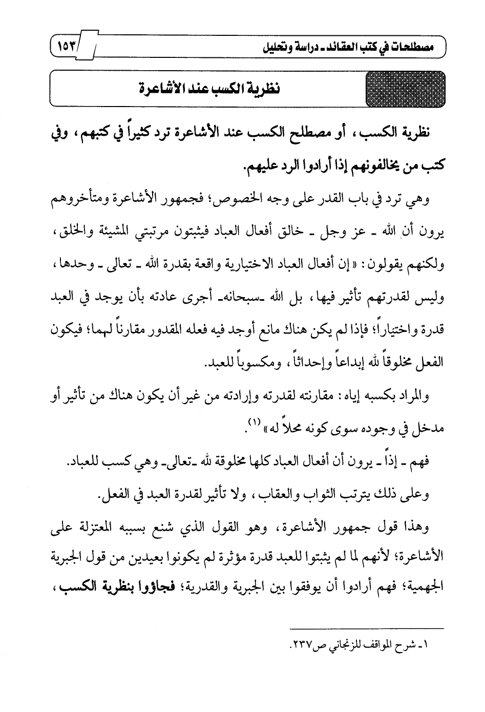 وهي ترد في باب القدر على وجه الخصوص؛ فجمهور الأشاعرة ومتأخروهم يرون أن الله _ عز وجل _ خالق أفعال العباد فيثبتون مرتبتي المشيئة والخلق، ولكنهم يقولون: "إن أفعال العباد الاختيارية واقعة بقدرة الله _ تعالى _ وحدها، وليس لقدرتهم تأثير فيها، بل الله _سبحانه_ أجرى عادته بأن يوجد في العبد قدرة واختياراً؛ فإذا لم يكن هناك مانع أوجد فيه فعله المقدور مقارناً لهما؛ فيكون الفعل مخلوقاً لله إبداعاً وإحداثاً، ومكسوباً للعبد.