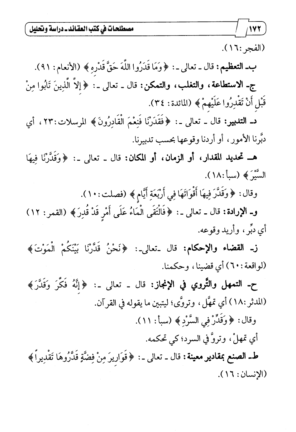 د_ التدبير: قال _ تعالى _: {فَقَدَرْنَا فَنِعْمَ الْقَادِرُونَ} المرسلات:23، أي دبَّرنا الأمور، أو أردنا وقوعها بحسب تدبيرنا.