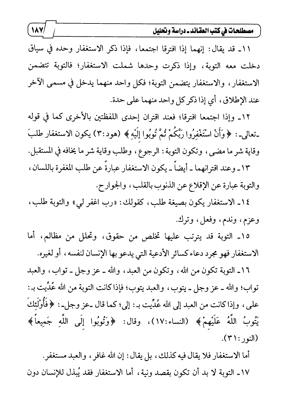 12_ وإذا اجتمعا افترقا؛ فعند اقتران إحدى اللفظتين بالأخرى كما في قوله _تعالى_: {وَأَنْ اسْتَغْفِرُوا رَبَّكُمْ ثُمَّ تُوبُوا إِلَيْهِ} [هود:3] يكون الاستغفار طلبَ وقاية شر ما مضى، وتكون التوبة: الرجوع، وطلب وقاية شر ما يخافه في المستقبل.