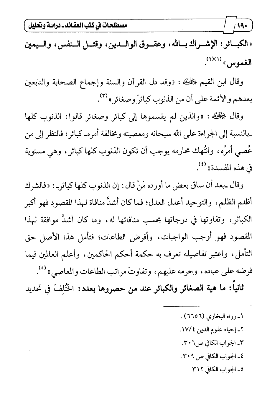 وقال ابن القيم رحمه الله: "وقد دل القرآن والسنة وإجماع الصحابة والتابعين بعدهم والأئمة على أن من الذنوب كبائرَ وصغائر"3.