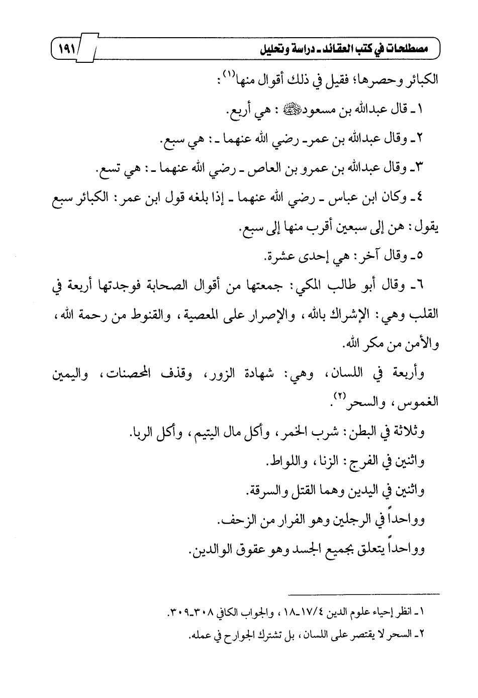 وأربعة في اللسان، وهي: شهادة الزور، وقذف المحصنات، واليمين الغموس، والسحر2.