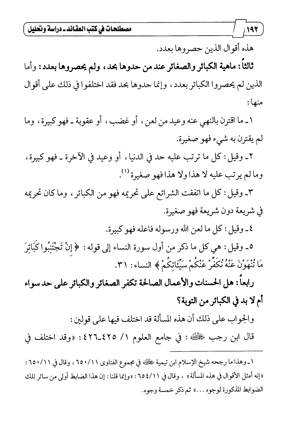 1_ وهذا ما رجحه شيخ الإسلام ابن تيمية × في مجموع الفتاوى 11/650، وقال في 11/650: "إنه أمثل الأقوال في هذه المسألة"، وقال في 11/654: "وإنما قلنا: إن هذا الضابط أولى من سائر تلك الضوابط المذكورة لوجوه ... " ثم ذكر خمسة وجوه.