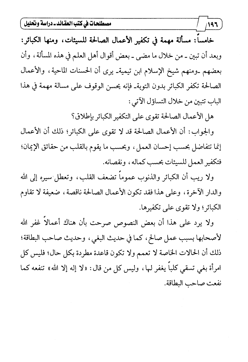 خامساً: مسألة مهمة في تكفير الأعمال الصالحة للسيئات، ومنها الكبائر: وبعد أن تبين _ من خلال ما مضى _ بعض أقوال أهل العلم في هذه المسألة, وأن بعضهم _ومنهم شيخ الإسلام ابن تيمية_ يرى أن الحسنات الماحية, والأعمال الصالحة تكفر الكبائر بدون التوبة_ فإنه يحسن الوقوف على مسالة مهمة في هذا الباب تتبين من خلال التساؤل الآتي:
