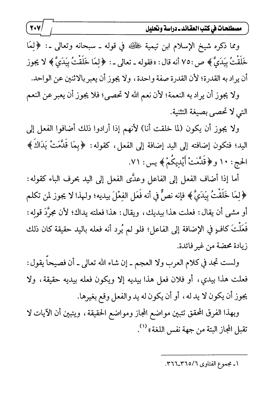 ومما ذكره شيخ الإسلام ابن تيمية رحمه الله في قوله _ سبحانه وتعالى _: {لِمَا خَلَقْتُ بِيَدَيَّ} [ص:75] أنه قال: "فقوله _ تعالى _: {لِمَا خَلَقْتُ بِيَدَيَّ} لا يجوز أن يراد به القدرة؛ لأن القدرة صفة واحدة، ولا يجوز أن يعبر بالاثنين عن الواحد.