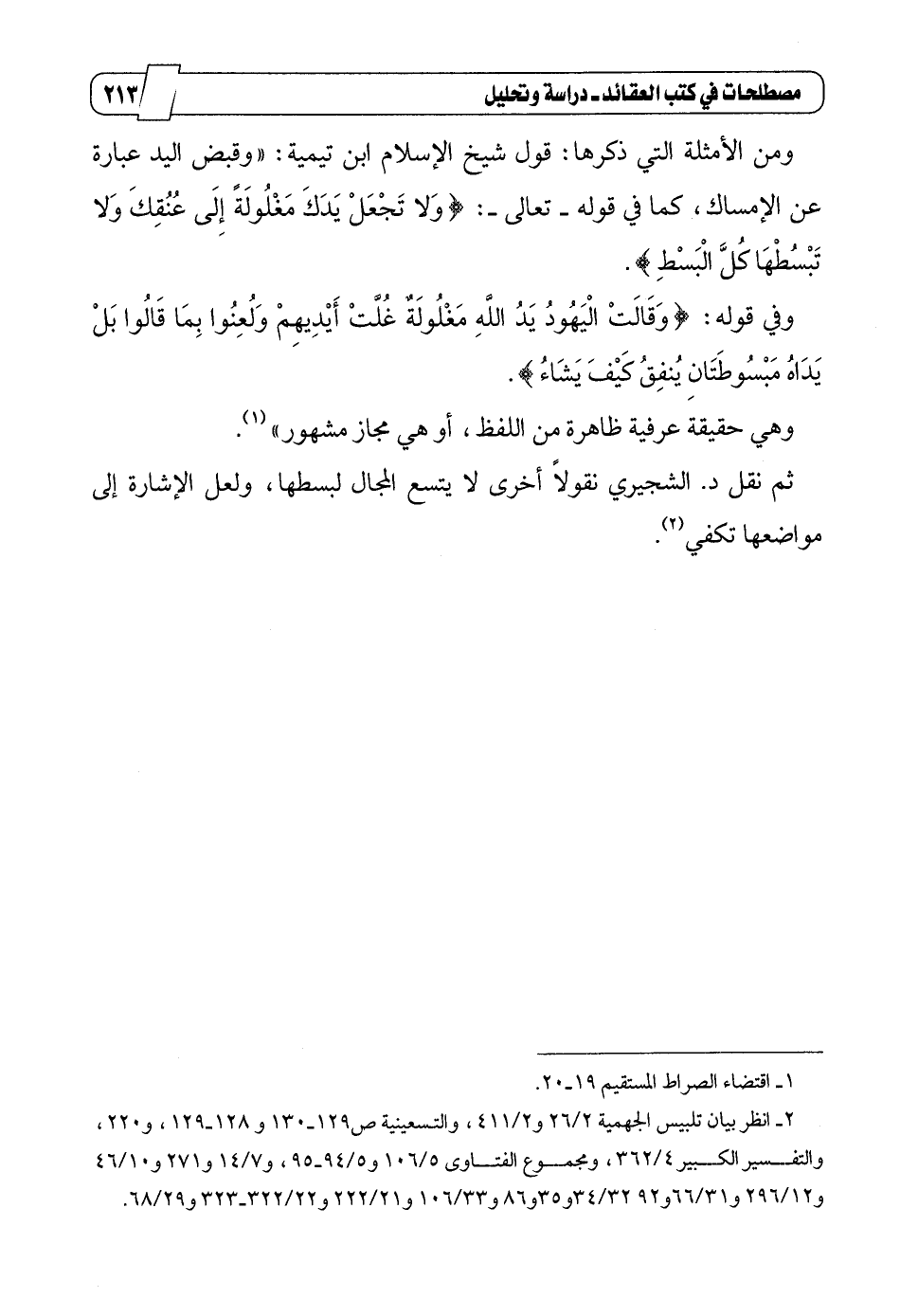ومن الأمثلة التي ذكرها: قول شيخ الإسلام ابن تيمية: "وقبض اليد عبارة عن الإمساك، كما في قوله _ تعالى _: {وَلا تَجْعَلْ يَدَكَ مَغْلُولَةً إِلَى عُنُقِكَ وَلا تَبْسُطْهَا كُلَّ الْبَسْطِ} .