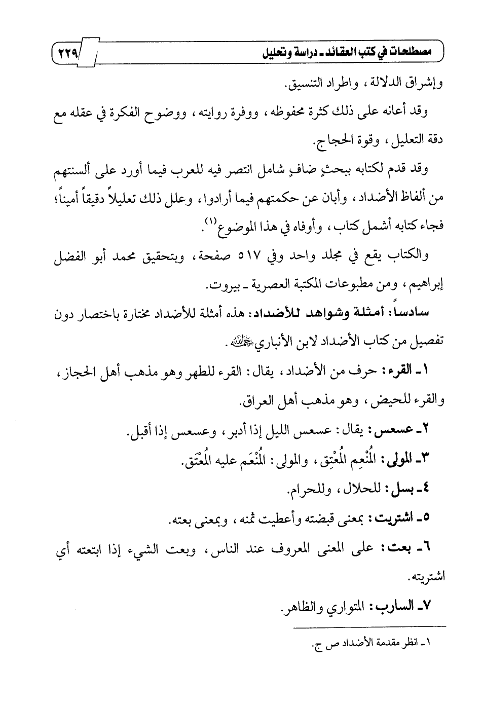 وقد قدم لكتابه ببحثٍ ضافٍ شامل انتصر فيه للعرب فيما أورد على ألسنتهم من ألفاظ الأضداد، وأبان عن حكمتهم فيما أرادوا، وعلل ذلك تعليلاً دقيقاً أميناً؛ فجاء كتابه أشمل كتاب، وأوفاه في هذا الموضوع1.