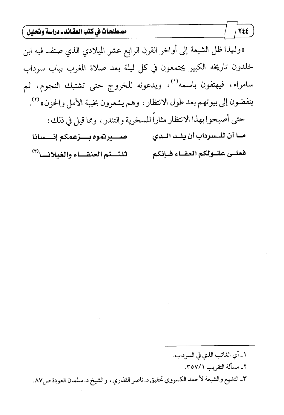 "ولهذا ظل الشيعة إلى أواخر القرن الرابع عشر الميلادي الذي صنف فيه ابن خلدون تاريخه الكبير يجتمعون في كل ليلة بعد صلاة المغرب بباب سرداب سامراء، فيهتفون باسمه1، ويدعونه للخروج حتى تشتبك النجوم، ثم ينفضون إلى بيوتهم بعد طول الانتظار، وهم يشعرون بخيبة الأمل والحزن"2.