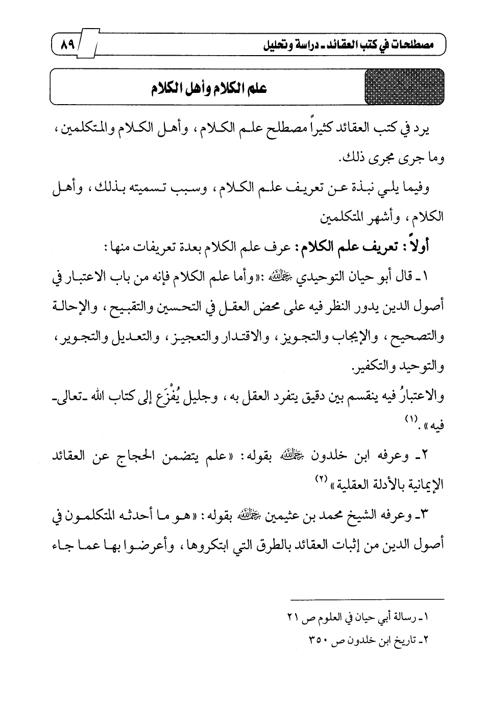 2_ وعرفه ابن خلدون رحمه الله بقوله: "علم يتضمن الحجاج عن العقائد الإيمانية بالأدلة العقلية"2