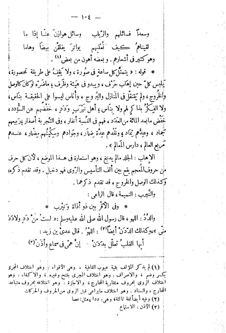قوله: يتمثل كل ساعة في صورة، ولا يقف على طريقة محصورة، يلبس كل حين إهاب حرف، ويبدو في هيئة وظرف؛ ما ضره لو كان كالوصل والخروج، ولم يتنقل في المنازل والبروج، وأناس ليسوا على الحقيقة بناس، ولا الفكر بذاكر لهم ولا بناس؛ أهل نيرب ودد، خفضهم عن السؤدد، خفض ما بعد المائة من العدد، فهم في النسبة أنفار، وفي التجربة أصفار، ربيعهم جماد، وعِدُّهم ثِمَاد؛ ونَقْدهم عِدَّة ضِمَار، وجَوادهم وسكيتُهم مِضْمار، عندهم مَربع العالم، دارس المعالم.
