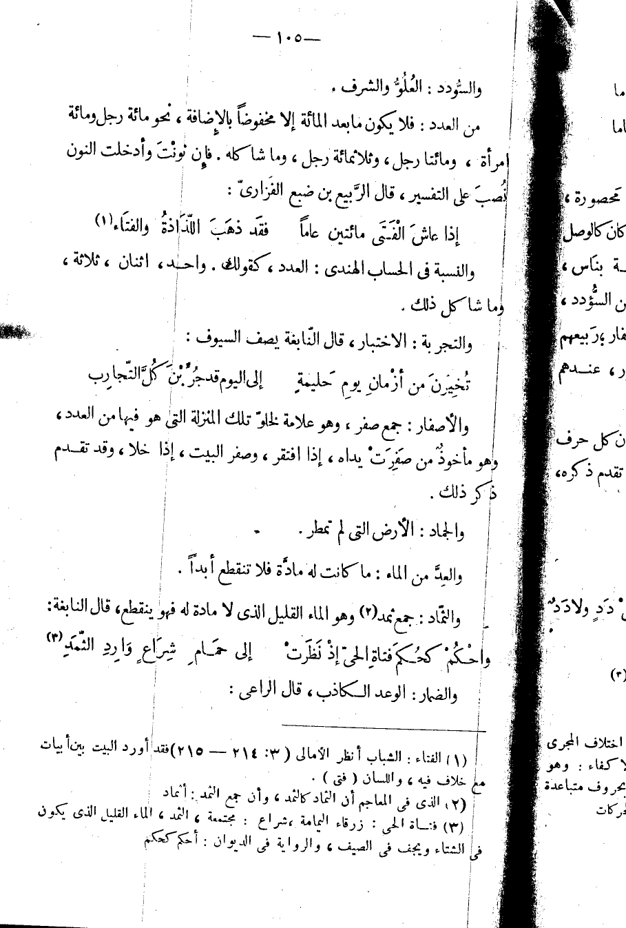 من العدد: فلا يكون ما بعد المائة إلا مخفوضاً بالإضافة، نحو مائة رجل ومائة امرأة، ومائتا رجل، وثلاثمائة رجل، وما شاكله، فإن نونت وأدخلت النون نصب على التفسير، قال الربيع بن ضبع الفزاري: