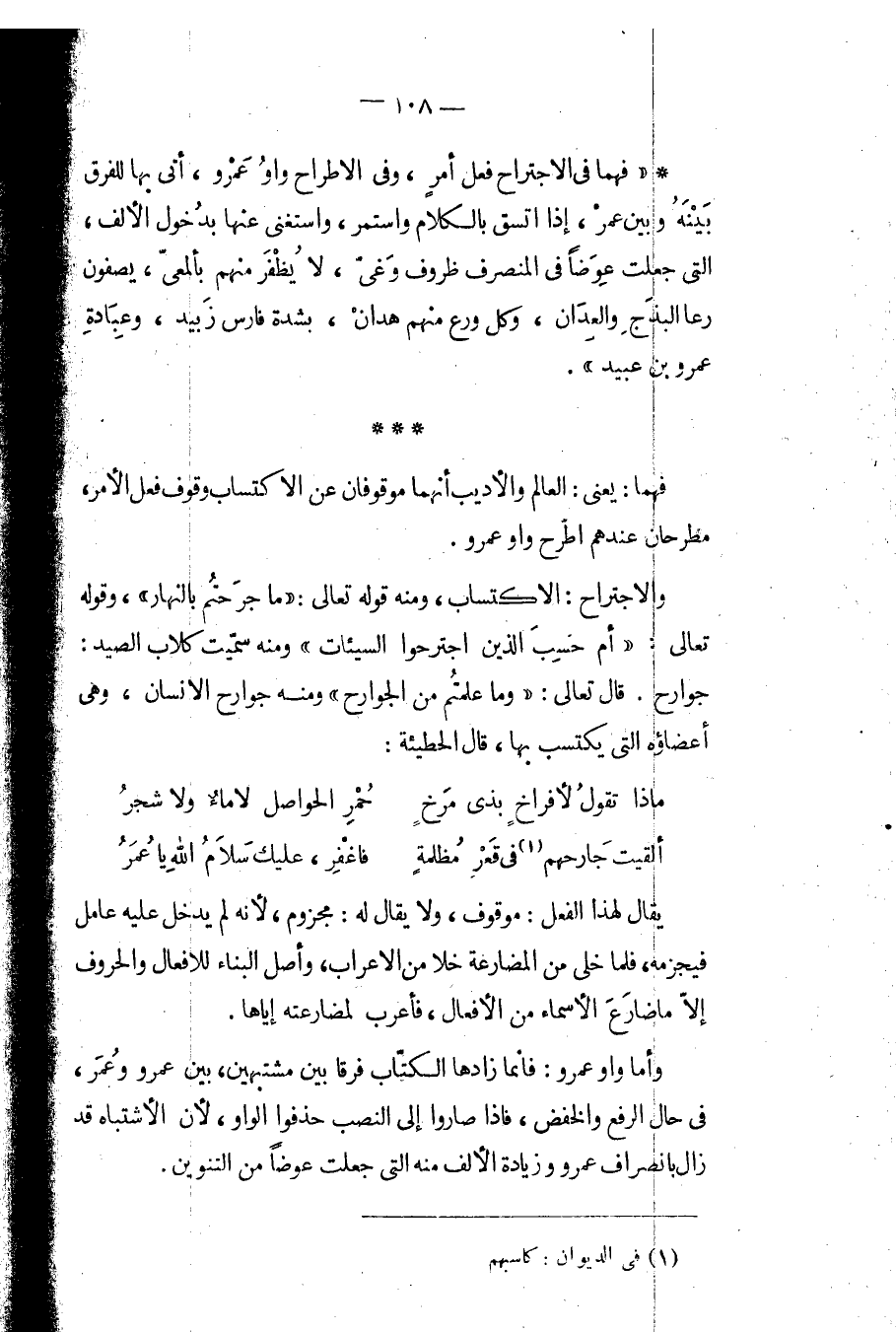 فهما في الاجتراح فعل أمر، وفي الإطراح واو عمرو، أتى بها للفرق بينه وبين عمر، إذا اتسق بالكلام واستمر، واستغنى عنها بدخول الألف، التي جعلت عوضاً في المنصرف ظروف وغى، لا يظفر منهم بألمعي، يصفون رعا البذج والعدان، وكل ورع منهم هدان، بشدة فارس زبيد، وعبادة عمرو بن عبيد.