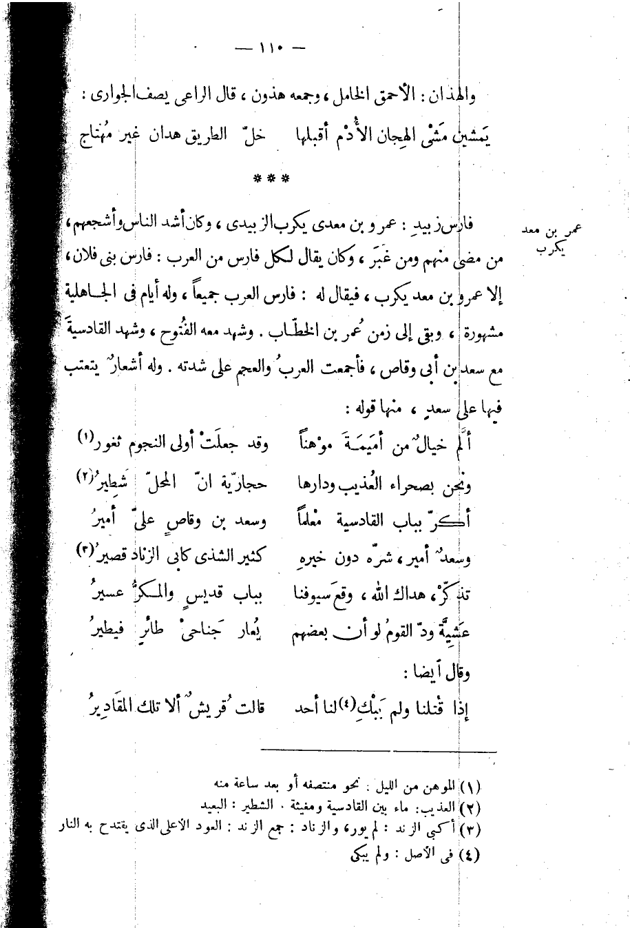 فارس زبيد: عمرو بن معدي يكرب الزبيدي، وكان أشد الناس وأشجعهم، من مضى منهم ومن غبر، وكان يقال لكل فارس من العرب: فارس بني فلان، إلا عمرو بن معد يكرب، فيقال له: فارس العرب جميعاً، وله أيام في الجاهلية مشهورة، وبقي إلى زمن عمر بن الخطاب. وشهد معه الفتوح، وشهد القادسية مع سعد بن أبي وقاص، فأجمعت العرب والعجم على شدته. وله أشعار يتعتب فيها على سعد، منها قوله: