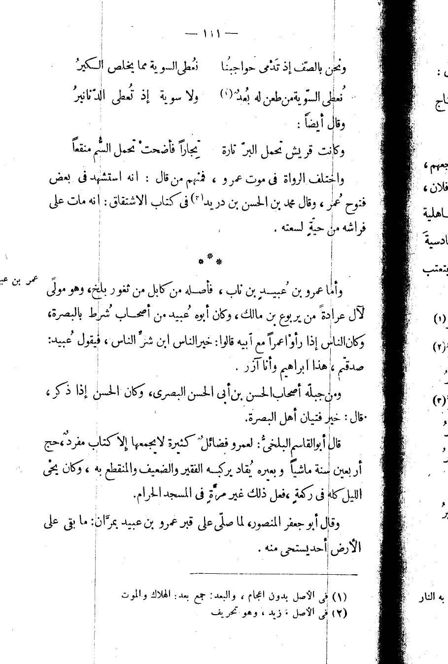 وأما عمرو بن عبيد بن ناب، فأصله من كابل من ثغور بلخ، وهو مولى لآل عرادة من يربوع بن مالك، وكان أبوه عبيد من أصحاب شرط بالبصرة، وكان الناس إذا رأوا عمراً مع أبيه قالوا: خير الناس ابن شر الناس، فيقول عبيد: صدقتم، هذا إبراهيم وأنا أزر.