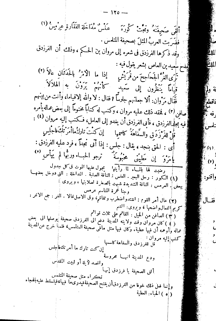 فقال مروان: ألا جعلتهم جلوساً؟ فقال: لا والله إلا قياماً، وأنت من بينهم صافن، فحقد ذلك عليه مروان، وكتب له كتاباً مختوماً إلى بعض عماله يأمره فيه يجلد الفرزدق، فأبى الفرزدق أن يغدو إلى العامل، فكتب إليه مروان: