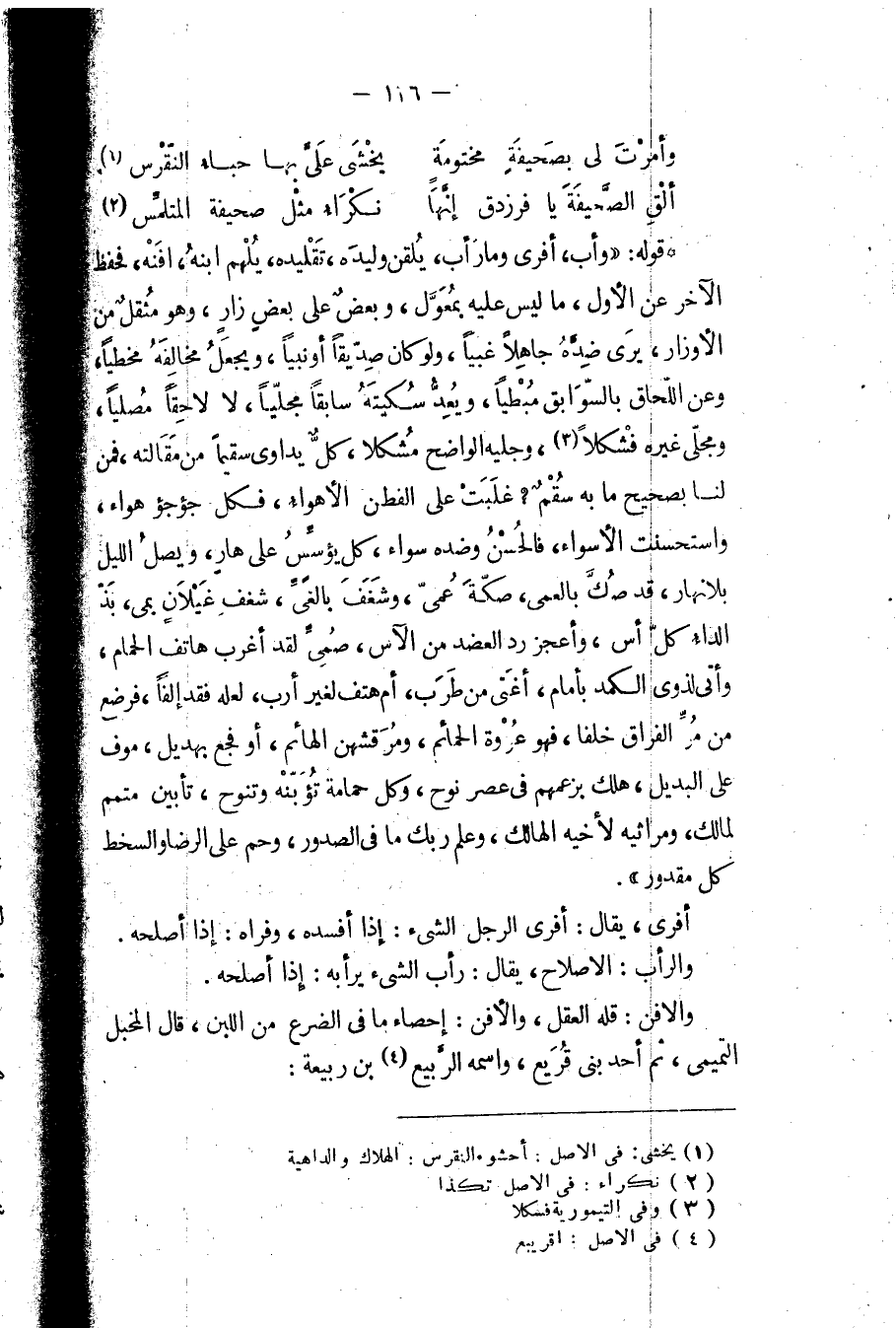 قوله وأب، أفرى وما رأب، يلقن وليده، تقليده، يلهم ابنه، افنه، فحفظ الآخر عن الأول، ما ليس عليه بمعول، وبعض على بعض زار، وهو مثقل من الأوزار، يرى ضده جاهلاً غبياً، ولو كان صديقاً أو نبياً، ويجعل مخالفه مخطياً، وعن اللحاق بالسوابق مبطياً، ويعد سكيته سابقاً مجلياً، لا لاحقاً مصلياً، ومجلى غيره فشكلاً، وجليه الواضح مشكلا، كل يداوي سقيماً من مقالته، فمن لنا بصحيح ما به سقم؟ غلبت على الفطن الأهواء، فكل جؤجؤ هواء، واستحسنت الأسواء، فالحسن وضده سواء، كل يؤسس على هار، ويصل الليل بلا نهار، قد صك بالعمى، صكة عمى، وشغف بالغي، شغف غيلان بمي، بذ الداء كل أس، وأعجز رد العضد من الآس، صمي لقد أغرب هاتف الحمام، وأتى لوي الكمد بإمام، أغتى من طرب، أم هتف لغير أرب، لعله فقد غلفاً، فرضع من مر الفراق خلفاً، فهو عروة الحمائم، ومرقشهن الهائم، أو فجع بهديل، موف على البديل، هلك بزعمهم في عصر نوح، وكل حمامة تؤبنه وتنوح، تأبين متمم لمالك، ومراثيه لأخيه الهالك، وعلم ربك ما في الصدور، وحم على الرضا والسخط كل مقدور.