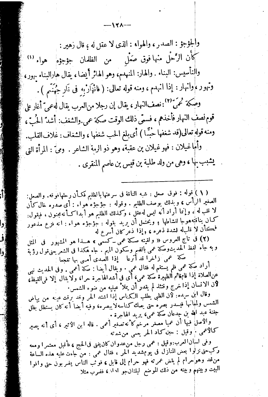 وصكة عمي: نصف النهار، يقال إن رجلاً من العرب يقال له عمي أغار على قوم نصف النهار فأخذهم، فسمي ذلك الوقت صكة عمي. والشغف: أشد الحب، ومنه قوله تعالى (قد شغفها حباً) أي بلغ الحب شغفها، والشغاف: غلاف القلب.
