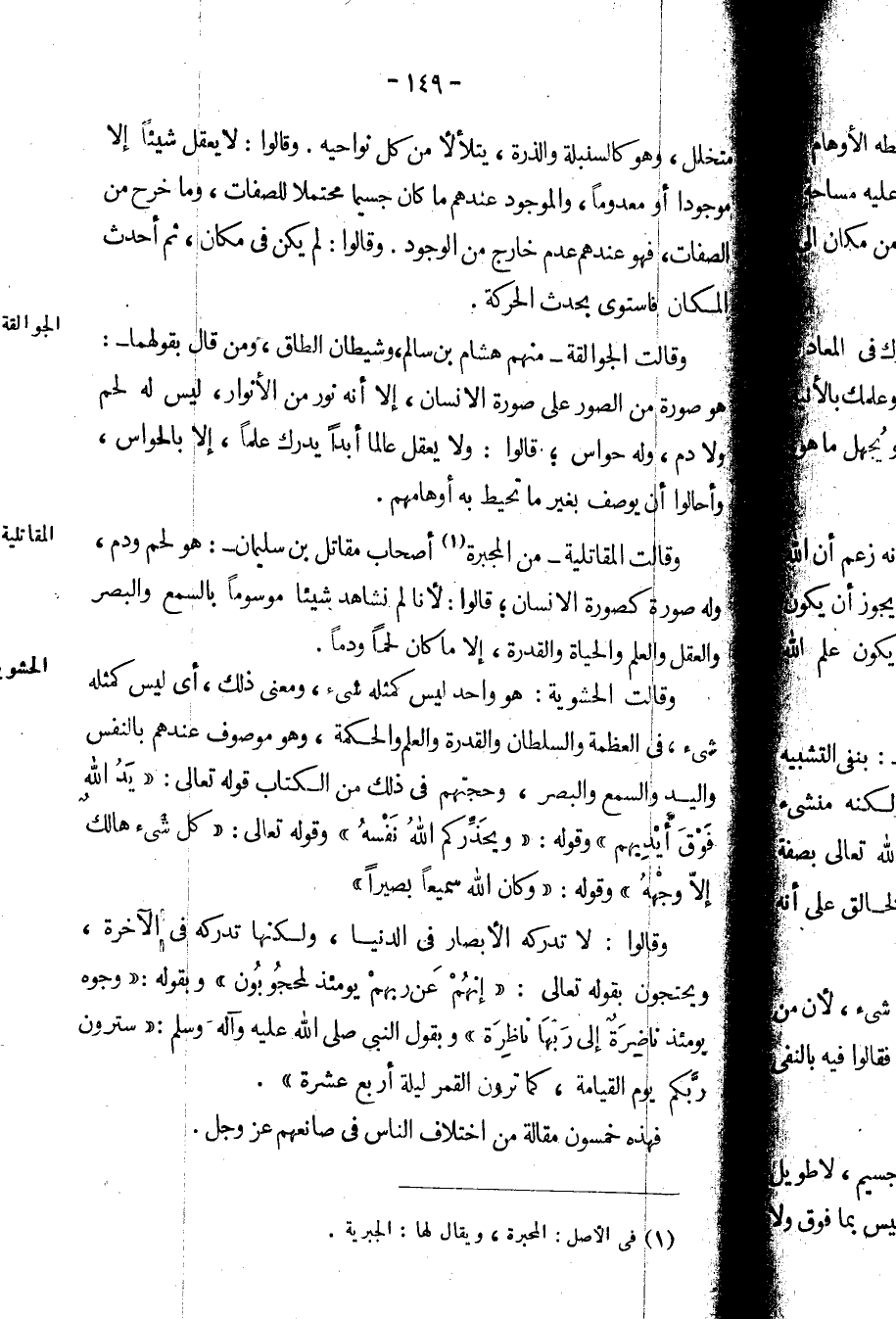 وقالت المقاتلية - من المجبرة أصحاب مقاتل بن سليمان -: هو لحم ودم، وله صورة كصورة الإنسان؛ قالوا: لأنا لم نشاهد شيئاً موسوماً بالسمع والبصر والعقل والعلم والحياة والقدرة، إلا ما كان لحماً ودماً.