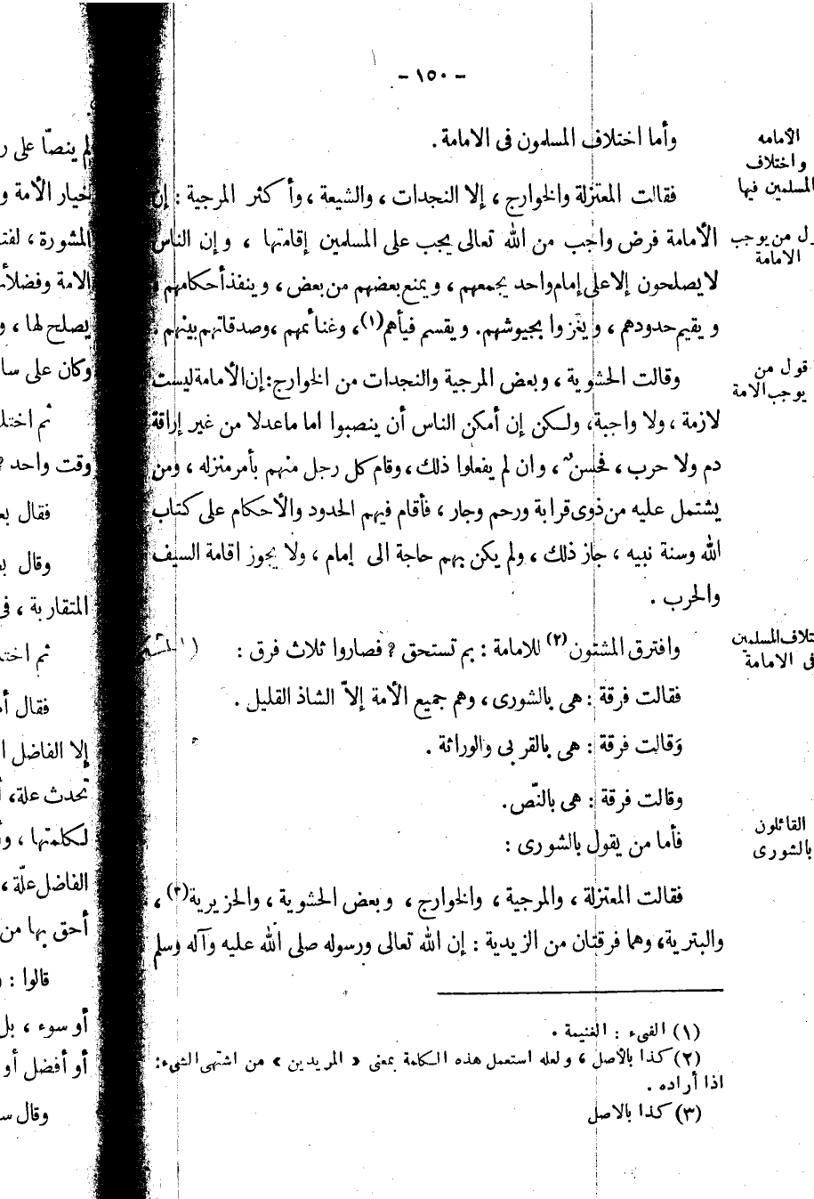 فقالت المعتزلة والخوارج، إلا النجدات، والشيعة، وأكثر المرجية: إن الإمامة فرض واجب من الله تعالى يجب على المسلمين إقامتها، وإن الناس لا يصلحون إلا على إمام واحد يجمعهم، ويمنع بعضهم من بعض، وينفذ أحكامهم، ويقيم حدودهم، ويغزوا بجيوشهم. ويقسم فيأهم، وغنائمهم، وصدقاتهم بينهم.