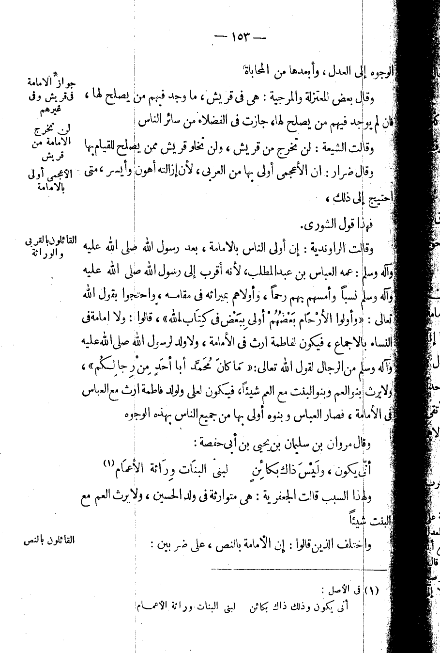 وقالت الراوندية: إن أولى الناس بالأمامة، بعد رسول الله صلى الله عليه وآله وسلم: عمه العباس بن عبد المطلب، لأنه أقرب إلى رسول الله صلى الله عليه وآله وسلم نسباً وأمسهم بهم رحماً، وأولاهم بميراثه في مقامه، واحتجوا بقول الله تعالى: (وأولوا الأرحام بعضهم أولى ببعض في كتاب الله) ، قالوا: ولا إمامة في النساء بالإجماع، فيكون لفاطمة إرث في الإمامة، ولا ولد لرسول الله صلى الله عليه وآله وسلم من الرجال لقول الله تعالى: (ما كان محمد أبا أحد من رجالكم) ، ولا يرث بنو العم وبنو البنت مع العم شيئاً، فيكون لعلي ولولد فاطمة إرث مع العباس في الإمامة، فصار العباس وبنوه أولى بها من جميع الناس بهذه الوجوه.