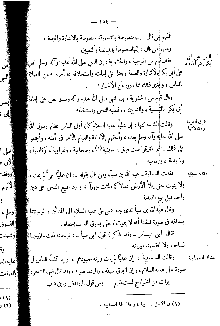 وقالت الشيعة كلها: إن علياً عليه السلام كان أولى الناس بمقام رسول الله صلى الله عليه وآله وسلم بعده، وأحقهم بالأمامة والقيام بالأمر في أمته، وأجمعوا على ذلك. ثم افترقوا ست فرق: سبئية، وسحابية، وغرابية، وكاملية، وزيدية، وإمامية.
