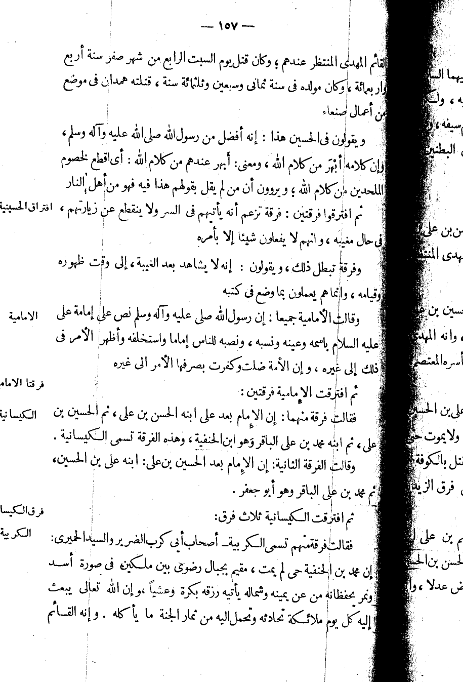 ويقولون في الحسين هذا: إنه أفضل من رسول الله صلى الله عليه وآله وسلم، وإن كلامه أبهر من كلام الله، ومعنى: أبهر عندهم من كلام الله: أي أقطع لخصوم الملحدين من كلام الله؛ ويروون أن من لم يقل بقولهم هذا فيه فهو من أهل النار.