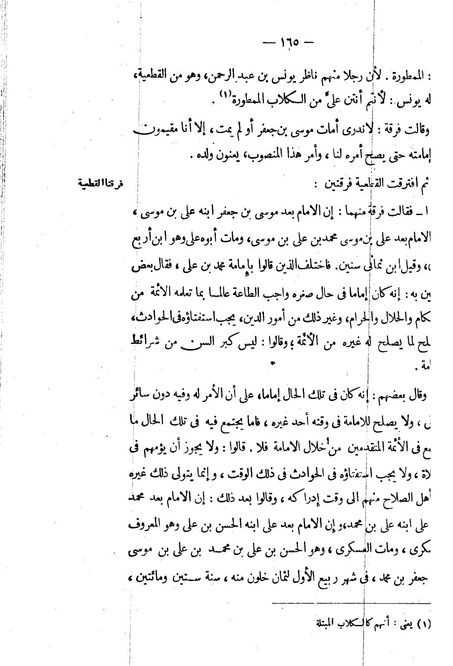 وقالت فرقة: لا ندري أمات موسى بن جعفر أو لم يمت، إلا أنا مقيمون على إمامته حتى يصح أمره لنا، وأمر هذا المنصوب، يعنون ولده.