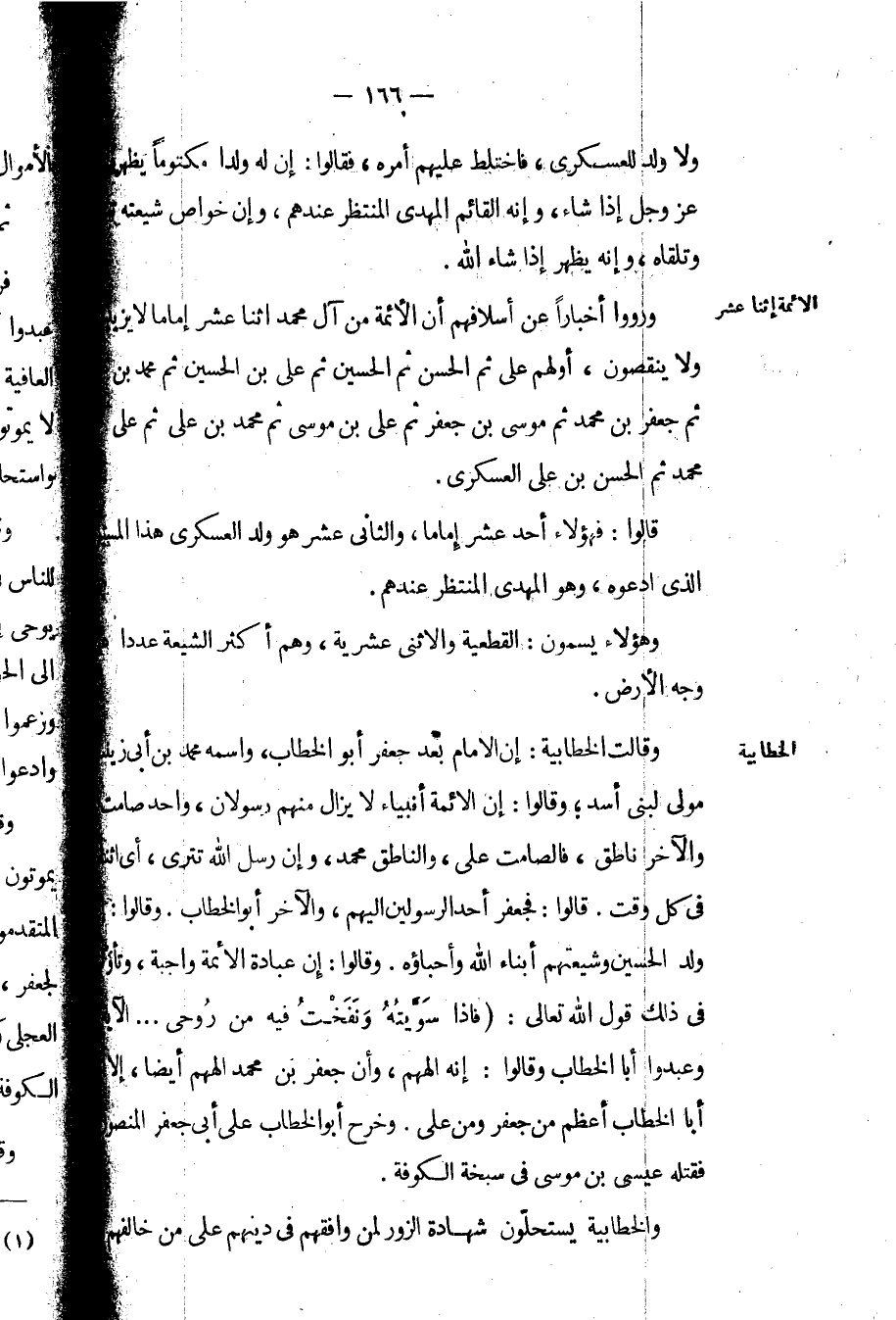 ولا ولد للعسكري، فاختلط عليه أمره، فقالوا: إن له ولداً مكتوماً يظهره الله عز وجل إذا شاء، وإنه القائم المهدي المنتظر عندهم، وإن خواص شيعته تعرفه وتلقاه، وإنه يظهر إذا شاء الله.