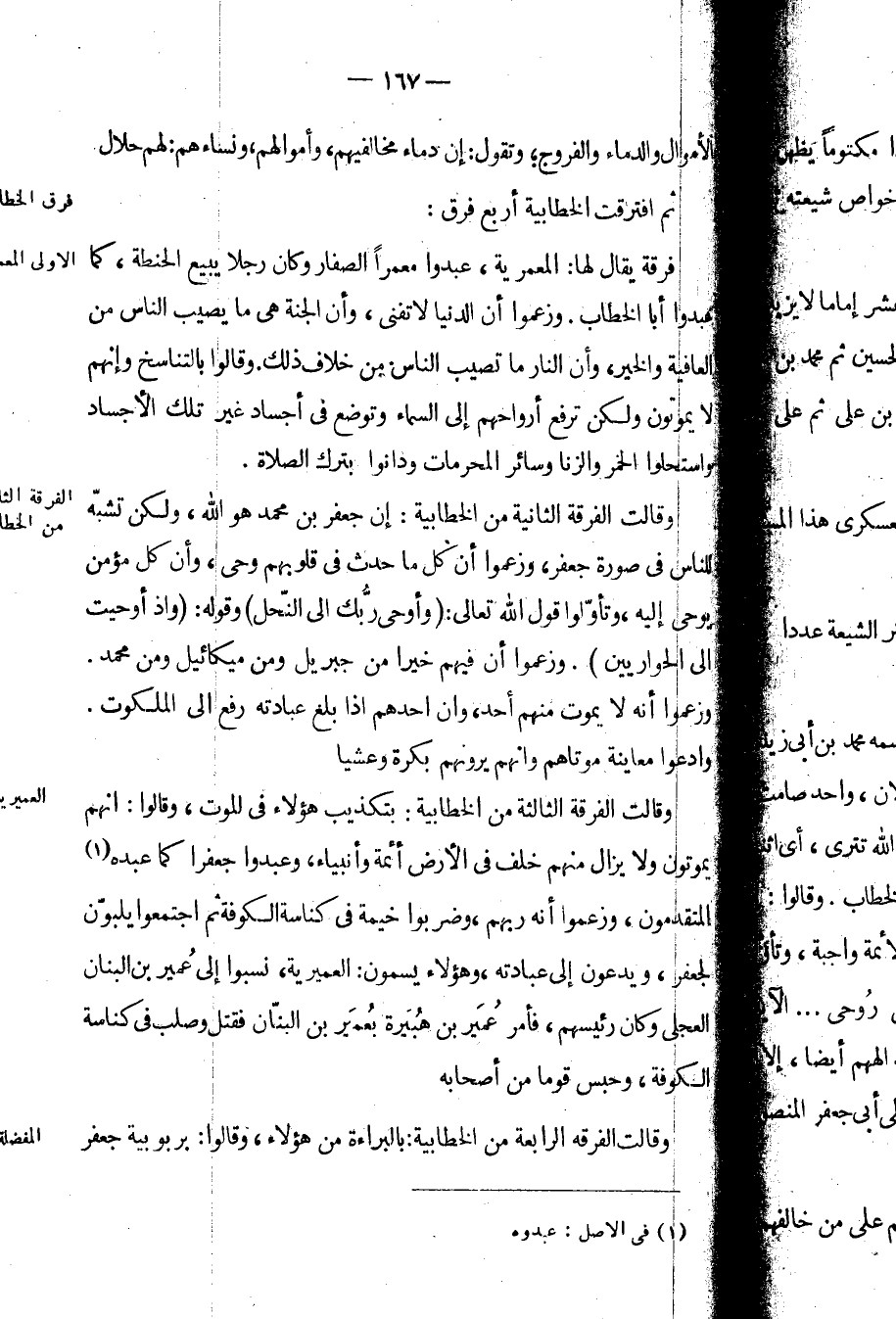 ثم افترقت الخطابية أربع فرق: فرقة يقال لها: المعمرية، عبدوا معمراً الصفار وكان رجلاً يبيع الحنطة، كما عبدوا أبا الخطاب. وزعموا أن الدنيا لا تفنى، وأن الجنة هي ما يصيب الناس من العافية والخير، وأن النار ما تصيب الناس من خلاف ذلك. وقالوا بالتناسخ وإنهم لا يموتون ولكن ترفع أرواحهم إلى السماء وتوضع في أجساد غير تلك الأجساد واستحلوا الخمر والزنا وسائر المحرمات ودانوا بترك الصلاة.