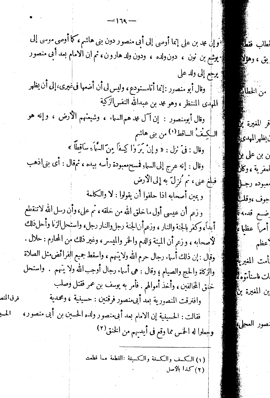 وإن محمد بن علي إنما أوصى إلى أبي منصور دون بني هاشم، كما أوصى موسى إلى يوشع بن نون، دون ولده، ودون ولد هارون، ثم أن الإمام بعد أبي منصور يرجع إلى ولد علي.