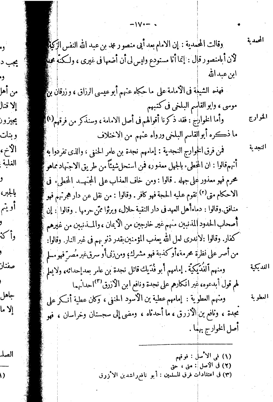 ومنهم العطوية: إمامهم عطية بن الأسود الحنفي، وكان عطية أنكر على نجدة، ونافع بن الأزرق، ما أحدثاه، ومضى إلى سجستان وخراسان، فهو أصل الخوارج بهما.
