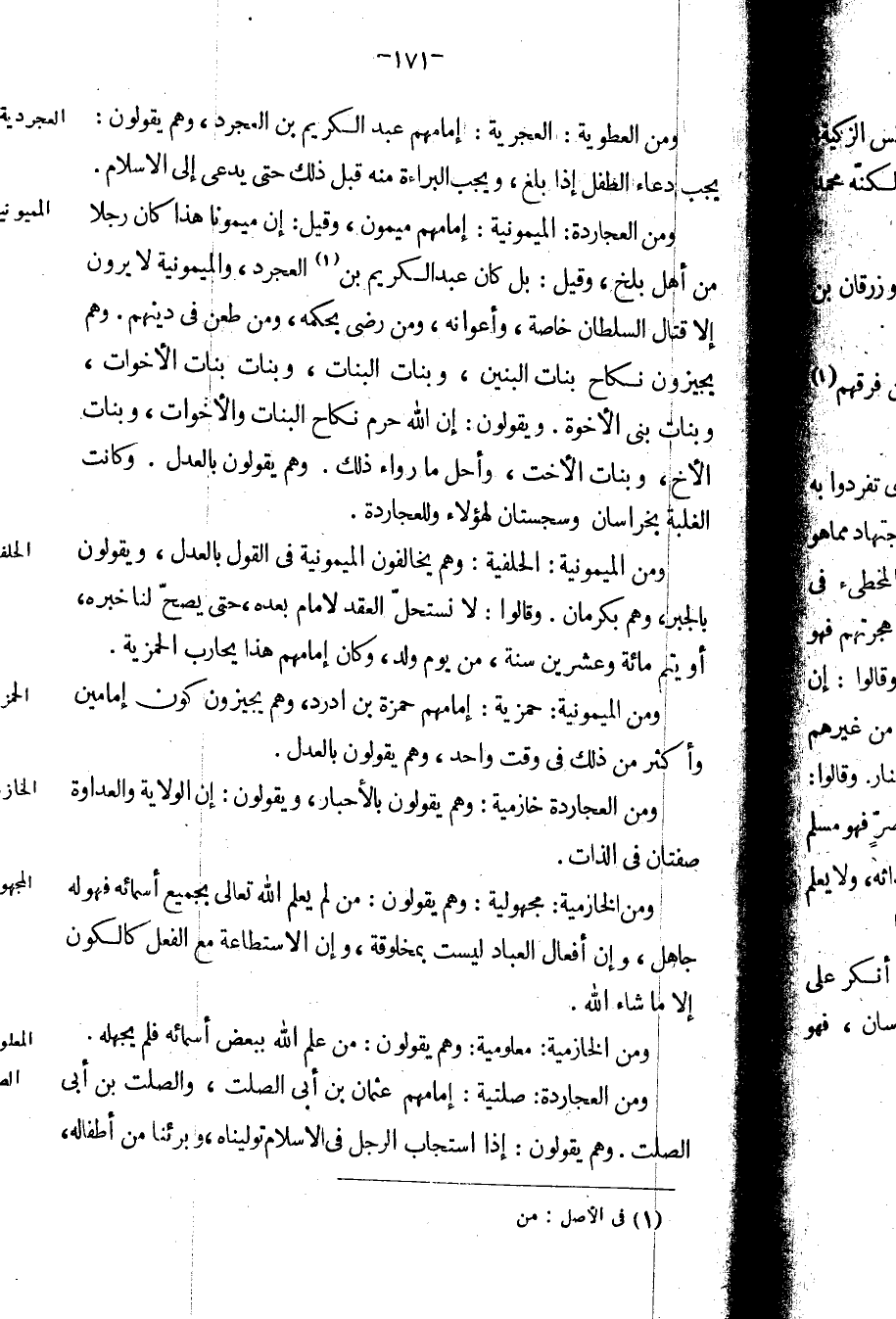 ومن العجاردة: الميمونية: إمامهم ميمون، وقيل: إن ميموناً هذا كان رجلاً من أهل بلخ، وقيل: بل كان عبد الكريم بن العجرد، والميمونية لا يرون إلا قتال السلطان خاصة، وأعوانه، ومن رضي بحكمه، ومن طعن في دينهم. وهم يجيزون نكاح بنات البنين، وبنات البنات، وبنات الأخوات، وبنات بني الأخوة. ويقولون: إن الله حرم نكاح البنات والأخوات، وبنات الأخ، وبنات الأخت، وأحل ما وراء ذلك. وهم يقولون بالعدل. وكانت الغلبة بخراسان وسجستان لهؤلاء وللعجاردة.