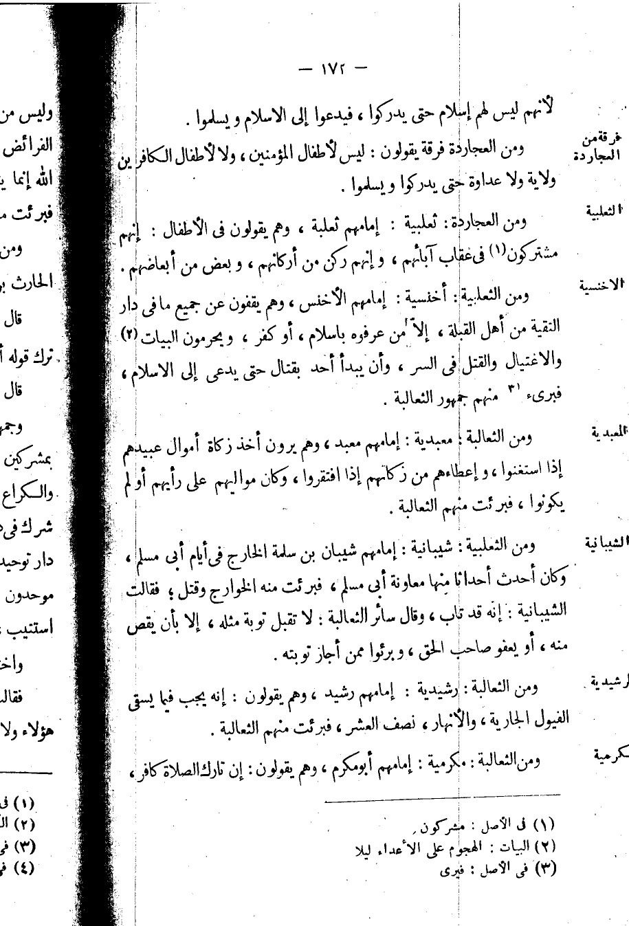 ومن الثعالبة: رشيدية: إمامهم رشيد، وهم يقولون: إنه يجب فيما يسقي الفيول الجارية، والأنهار، نصف العشر، فبرئت منهم الثعالبة.
